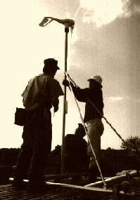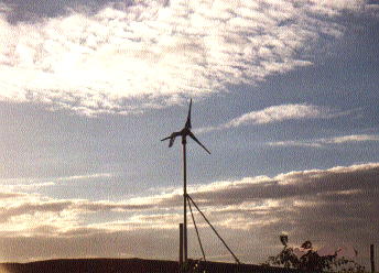 | 福祉農園にエコ発電機がやってきた日。 2000年4月29日は「みどりの日」エコ発電機を福祉農園のプレハブ小屋の上に設置作業を行った。 農園ボランティアの浜田さんは機械整備のプロ。作業は予想以上の早さで進んだ。午後3時過ぎには発電機を設置する作業は無事終了し、風と日の光を受けて発電器は早速充電を開始する。 |